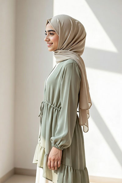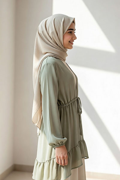 Available in soft sage-green (as shown) and other seasonal shades. Perfect for casual campus days, family gatherings, or light outings - modest fashion that feels effortlessly chic.