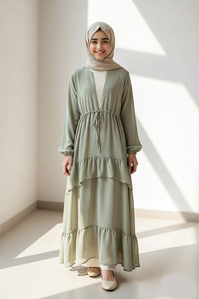 This elegant modest layered maxi dress from Bia combines timeless grace with everyday comfort, perfect for university-going young women seeking a stylish, hijab-friendly look.