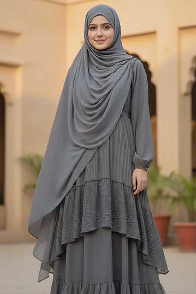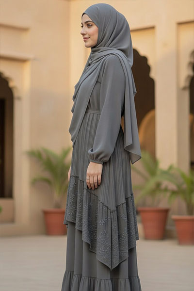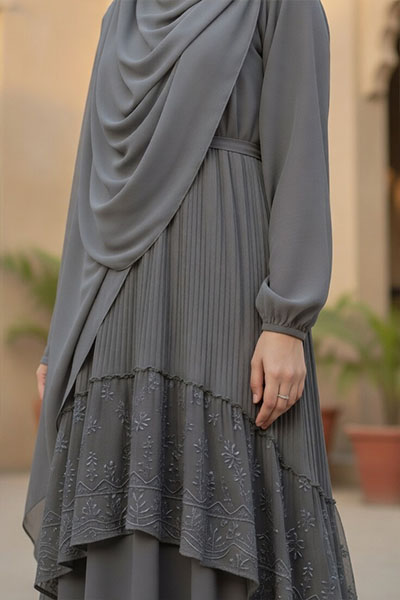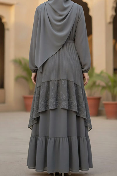 This elegant grey abaya-style dress is crafted from premium lightweight chiffon, offering a soft, airy drape and subtle sheen that flows beautifully with movement.