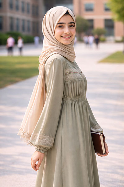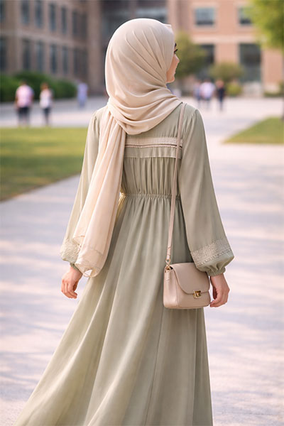 The long sleeves have matching intricate lace trim at the cuffs and a light, breathable finish. The skirt is full-length and flows gently, making it perfect for formal events, daytime outings, or special occasions. This modest-style dress comes with a convenient side zipper and is fully lined for comfort. For styling, it pairs beautifully with the included neutral beige hijab, a simple crossbody bag, and heels or flats.